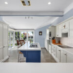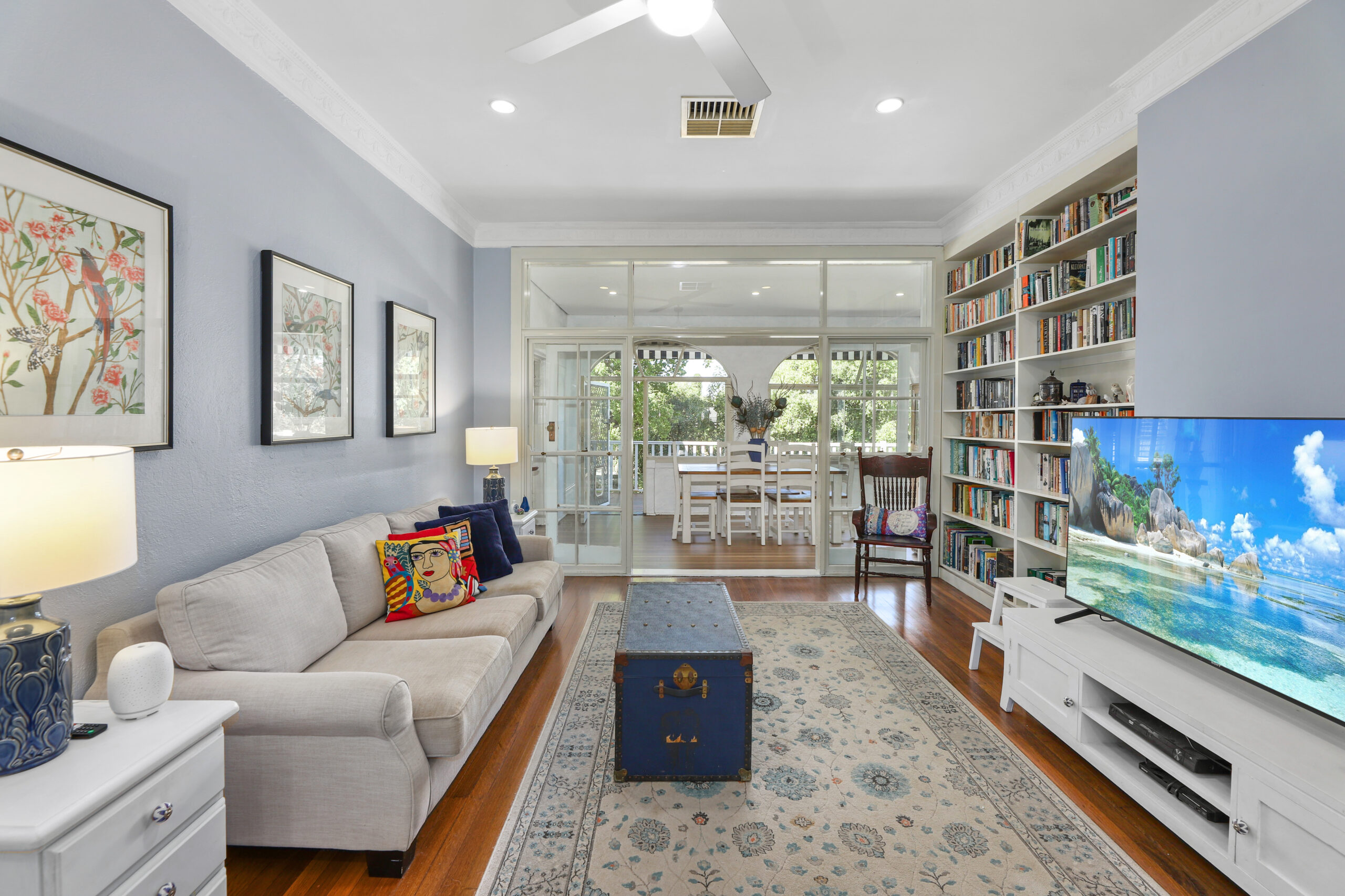 Separate sunroom/dining area; and open-plan kitchen/living zone flowing to outdoor deck.